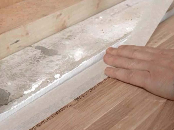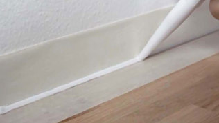 Fugen påføres imellem de to stykker malertape ved samlingen mellem bordpladen og væggen