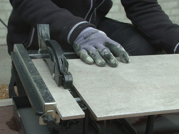 Ved tilskæring af fliserne bruges en vådskæremaskine eller vinkelsliber med diamantklinge. Husk høreværn og sikkerhedsbriller til dette arbejde. Her skal der bruges vand, så det er udendørs arbejde. Skal der skæres et hul til fx stikkontakt kan du bore et hul med boremaskinen i området, der skal skæres væk. Derefter bruges en stiksav med en særlig klinge med granulat til at skære i sten og fliser.