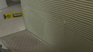 Påfør fliseklæberen med tandspartlen i et jævnt lag på et område, der ikke er for stort – ca. 1 m² ad gangen, så det ikke kan nå at tørre. Træk laget over med tænderne på tandspartlen, så det bliver ensartet. Kommer der fliseklæb på forsiden af fliserne, skal det tages af med det samme med en fugtig klud, da det ikke er til at få af, hvis det hærder op.