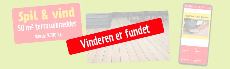 13. april 2026Vinderen af 50 m² terrassebrædder til en værdi af 9.700 kr. er fundet. Stort tillykke til Ulla fra Rødkærsbro.