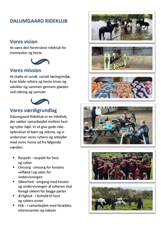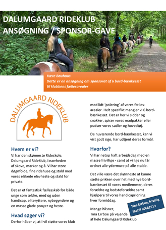 Vi har den skønneste Rideskole, Dalumgaard Rideklub, i nærheden af skove, marker og å. Vi har store døgnfolde, fine ridehuse og stald med vores elskede elevheste og stald for private. Det er et fantastisk fællesskab for både unge som ældre, med og uden handicap, eliteryttere, nybegyndere og en masse glade ponyer og heste. Vi søger, fordi vi netop haft arbejdsdag med en masse frivillige - samt at vi lige nu får ordnet alle ydermure på vores stalde. Det ville være det skønneste at kunne sætte prikken over i’et med nye bord-bænkesæt til fællesarealerne!