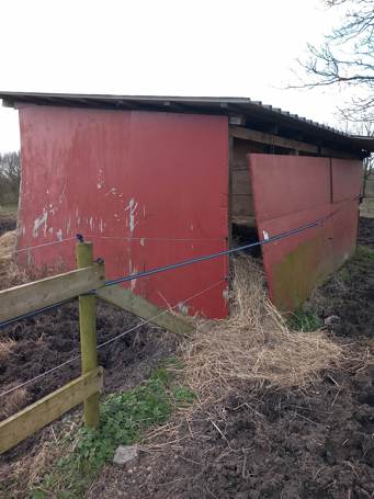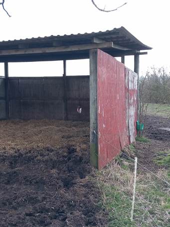 Af velfærdsmæssige årsager går stort set alle rideskolens heste samt størstedelen af opstaldernes heste i løsdrift, dvs. på fold hele året rundt. Lovmæssigt kræver det et læskur, som hestene kan søge ind i, når de har behov for det. Rideskolen har lige nu 2 læskure, men som billederne viser, har disse læskure set bedre dage, og vi ønsker derfor at fjerne de gamle og bygge et helt nyt læskur til hestene. Etableringen af læskuret står klubben selv for, idet vi er så heldige at have engagerede medlemmer med håndværksmæssig baggrund og erfaring.