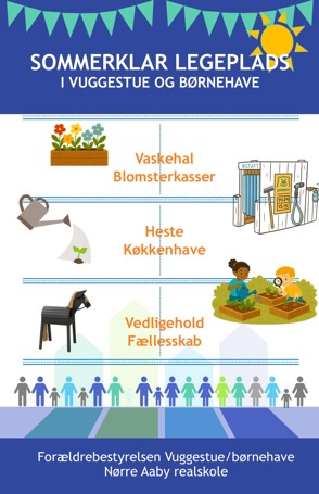 Sommerklar legeplads – med plads til leg, læring og grønne fællesskaber Vi er en engageret forældre gruppe tilknyttet børnehave og vuggestue på Nørre Aaby Realskole. Hvert år samles vi til en arbejdsdag, hvor vi giver noget tilbage til det sted, der hver dag skaber tryghed, udvikling og glæde for vores børn. Det er en dag med fællesskab, knokleri og hygge – og en vigtig tradition for både børn, personale og forældre. Børnene tilbringer mange timer udendørs året rundt, og legepladsen er et centralt lærings- og legeområde. Børnehaven arbejder bevidst med at skabe forskellige “rum”, hvor børnene kan skifte mellem aktiv leg, ro, fordybelse og naturbaseret læring. I år står vi overfor en større opgave end normalt og søger derfor støtte til at gøre legepladsen mere sikker, inspirerende og grøn. Det søger vi støtte til • Male og renovere legehuset, så det igen bliver et trygt sted for rolleleg • Udskifte det slidte og utætte tag på legehuset. • Etablere en køkkenhave, hvor børnene selv kan så, passe og høste grønt til deres maddage og lære om natur, mad og ansvar • Opsætte blomsterkummer til den årlige Blomsternes Dag og skabe farver og biodiversitet • Opsætte stolper til hængekøjer, så børnene får et roligt sansende område • Bygge vores egen ”vaskehal” klar til mange timers sjov. Hvad støtten betyder Støtten vil løfte arbejdsdagen fra almindelig vedligehold til et projekt, der skaber varig værdi. Den gør det muligt at: • skabe tydelige lærings- og legeområder i naturen • styrke børnenes trivsel gennem både aktiv og rolig leg • forbedre sikkerheden på legepladsen • give børnene et grønt område, de selv er med til at dyrke og passe • styrke fællesskabet mellem forældre, personale og børn. Mange hilsner fra Forældre bestyrelsen i Vuggestue og børnehave på Nørre Aaby realskole.