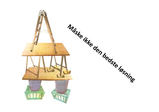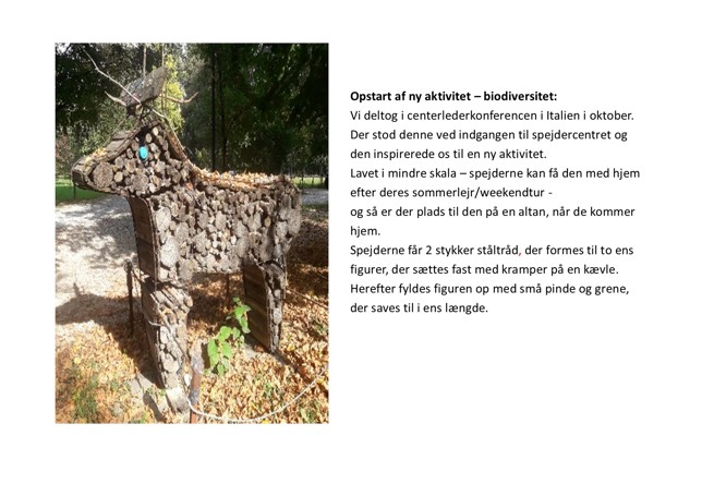 Vi mangler et par stilladser, når vi skal kalke gården og male vores garage til foråret. Vi har efterhånden lejet et stillads en del gange – og så blev det regnvejr på vores arbejdsweekend. Med vores egne stilladser har pensionistholdet (8 pensionister, både tidligere og nuværende spejdere) mulighed for at få malet/kalket – det er lidt nemmere bare at gå i gang, når stilladset står der – og vejret er til det. Lige nu har vi også en del murerarbejde rundt om et par vinduer på 1. sal. 2 stilladser ville være optimalt. En ny aktivitet – biodiversitet: Vi deltog i centerlederkonferencen i Italien i oktober. Der stod en biodiversitets-ko ved indgangen til spejdercentret og den inspirerede os til en ny aktivitet. Lavet i mindre skala – spejderne kan få den med hjem efter deres sommerlejr/weekendtur - og så er der plads til den på en altan, når de kommer hjem. Spejderne får 2 stykker ståltråd, der formes til to ens figurer, der sættes fast med kramper på en kævle. Herefter fyldes figuren op med små pinde og gr