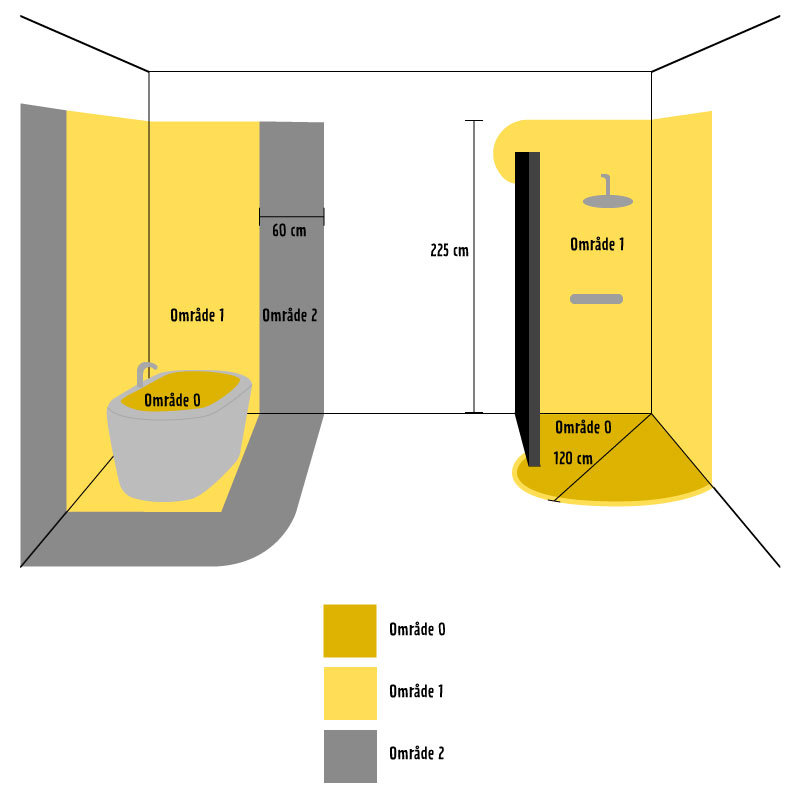 Hvor stort et areal de forskellige områder dækker, afhænger af hvilken type bad du har. Har du badekar, brusebassin eller lukket bruseniche, findes både område 0, 1 og 2. Men har du i stedet en skillevæg, et bruseforhæng eller lignende løsning som afskærmning, bortfalder område 2, og område 1 udvides i stedet.
